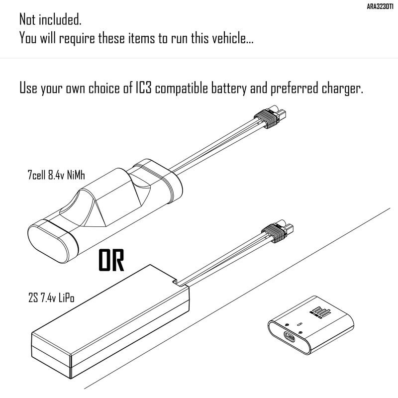 • (1) 7-Cell NiMH or 2S LiPo battery with IC3/EC3 Connector